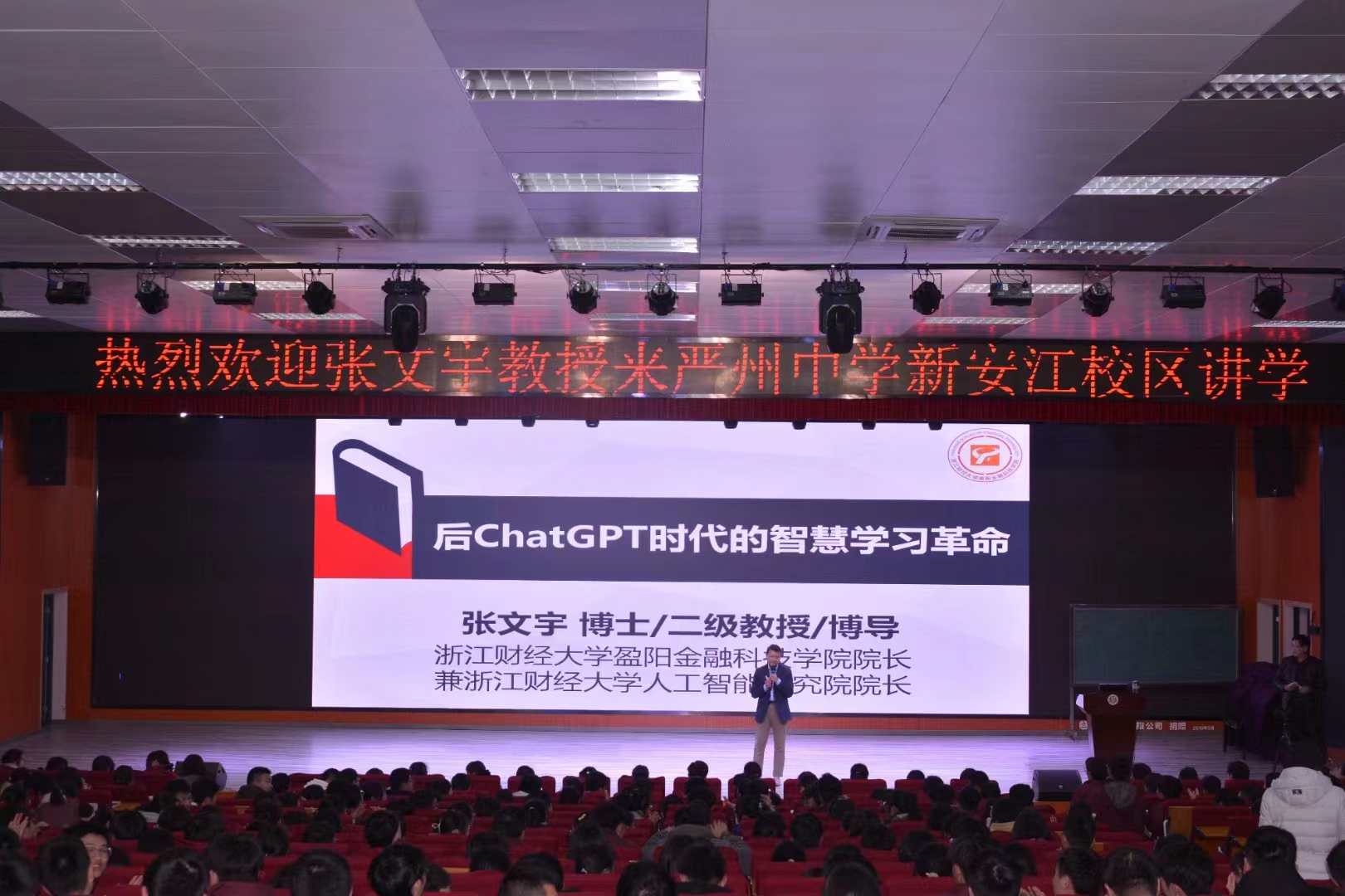 张文宇教授结合当前热点,作了题为“后ChatGPT时代的智慧学习革命”的专题讲座。讲座由建德市教育局副局长兼严州中学校长赖忠林担任主持。800人的报告厅座无虚席,连走廊都挤满了学生。张文宇一如既往以“激情才情真情兼备,风趣幽默接地气”的演讲风格使现场欢呼声不断、爆笑全场,收获了20余次掌声。