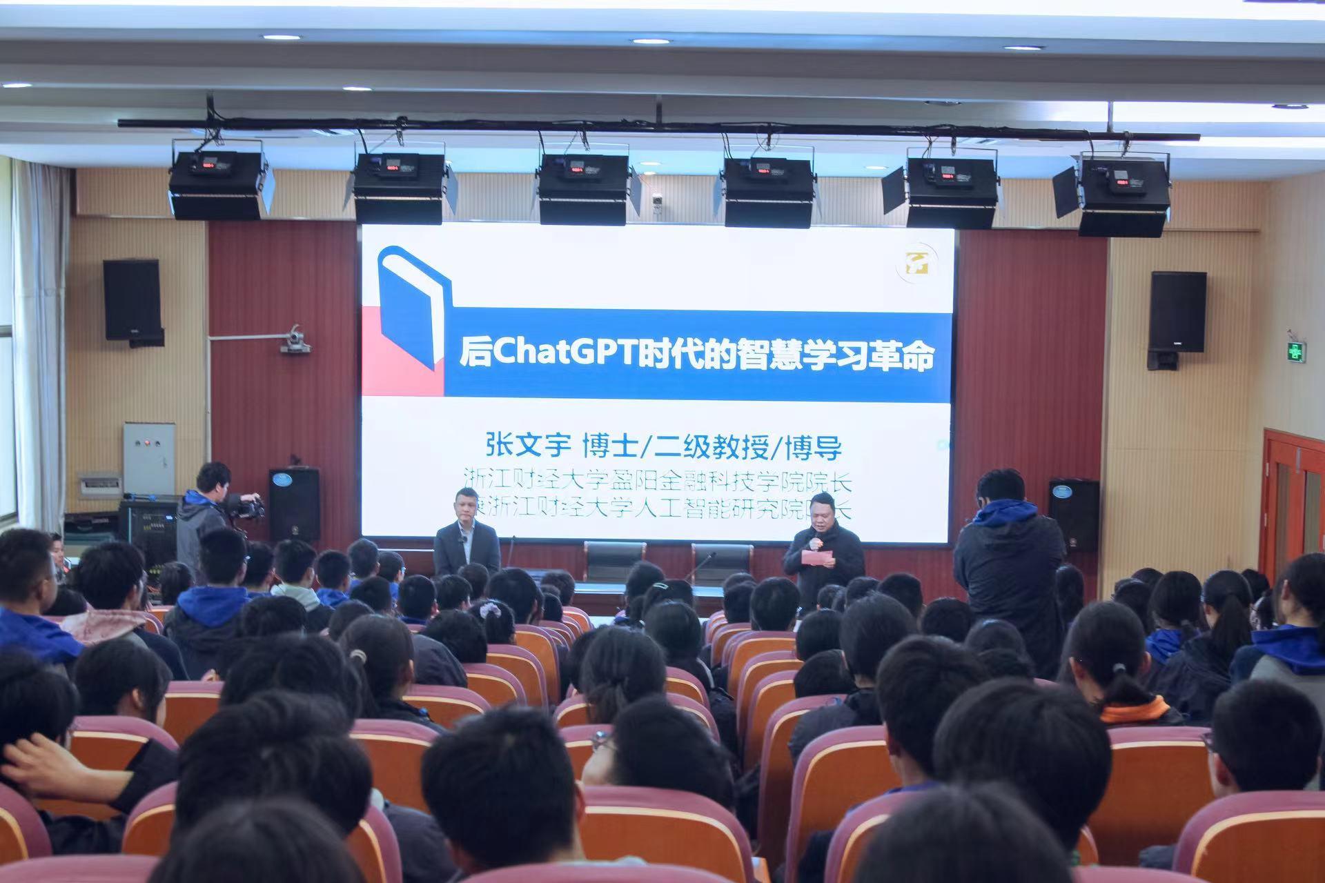 院长张文宇教授应邀前往杭州第四中学吴山校区(浙江省一级重点中学)开展“教授博士进中学”活动,并结合当前热点,作“后ChatGPT时代的智慧学习革命”主题的科普讲座,受到杭州第四中学吴山校区师生的热烈欢迎。校区以科学馆阶梯教室为主会场,高一各班教室(实时直播)为分会场开展了“养正大讲堂”的开春第一课。