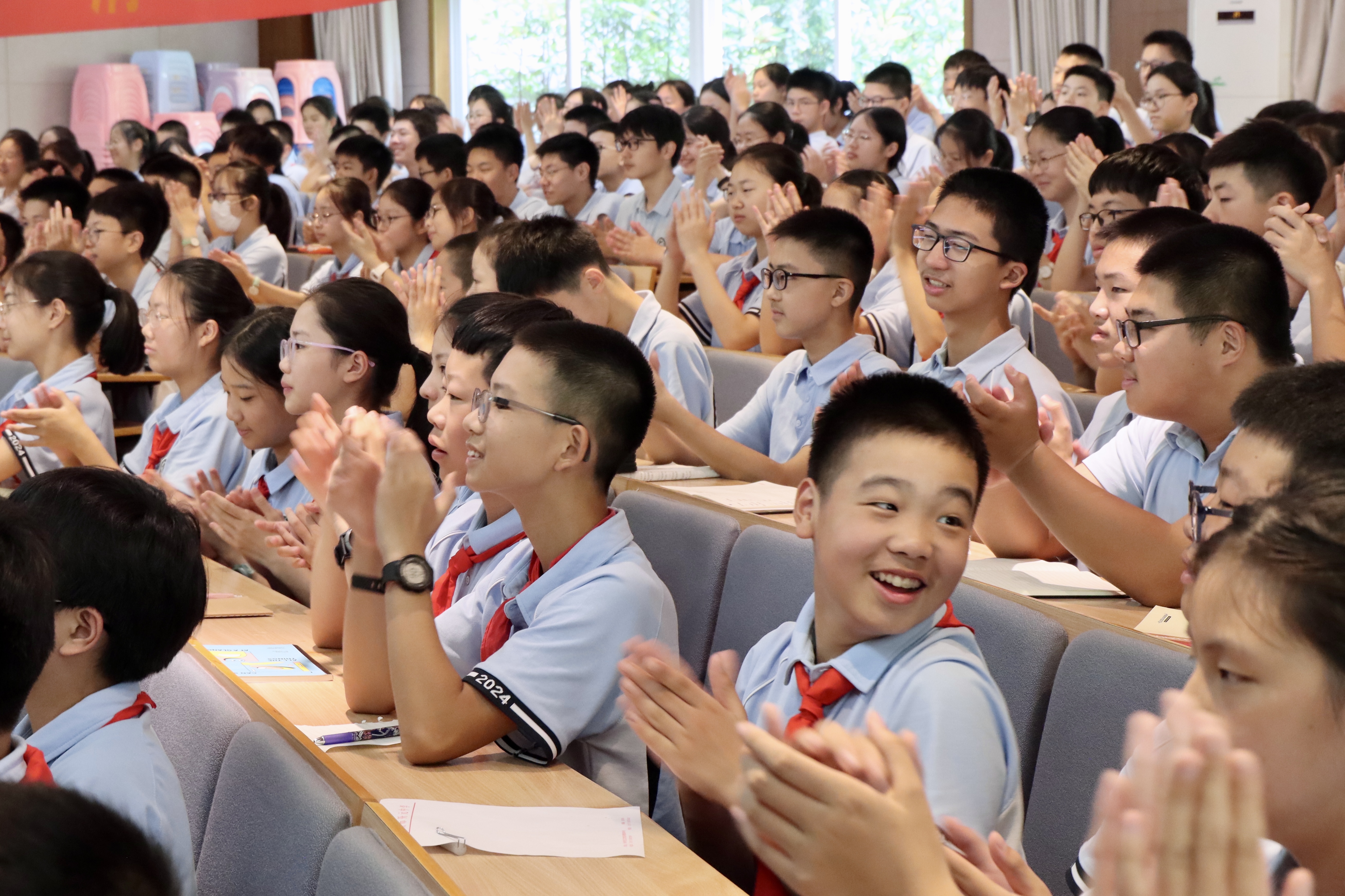 在杭州市科技工作者服务中心主任蒋晓斌与开元中学党总支书记方斌的共同启动下,一场高燃有爱的开学第一课《分数之上 与AI同行》在杭州市开元中学的开学典礼上开启。简直是脱口秀专场,全校1000多名学生分别在主会场和线上分会场拍红了小手、欢呼声不断、爆笑全场。