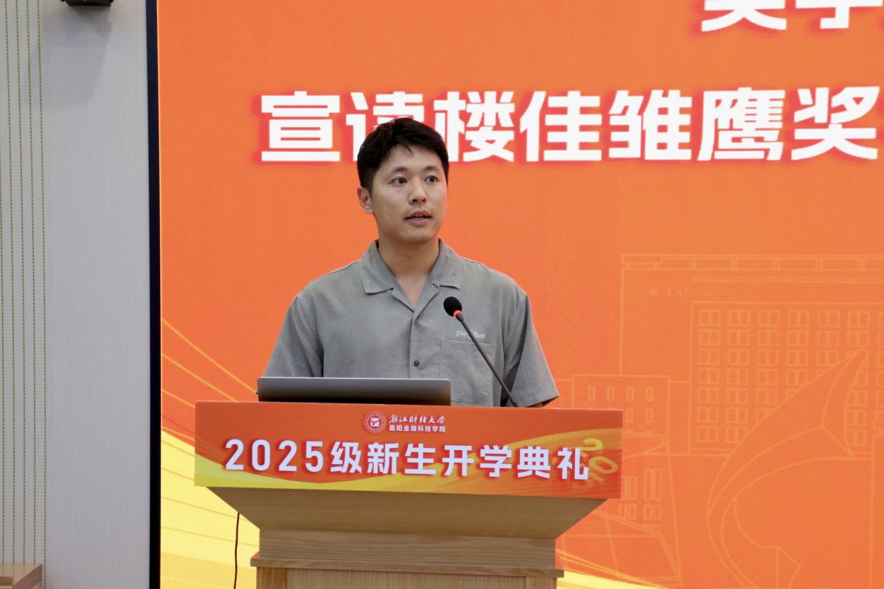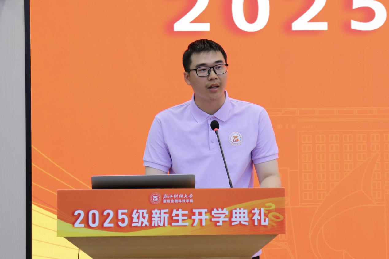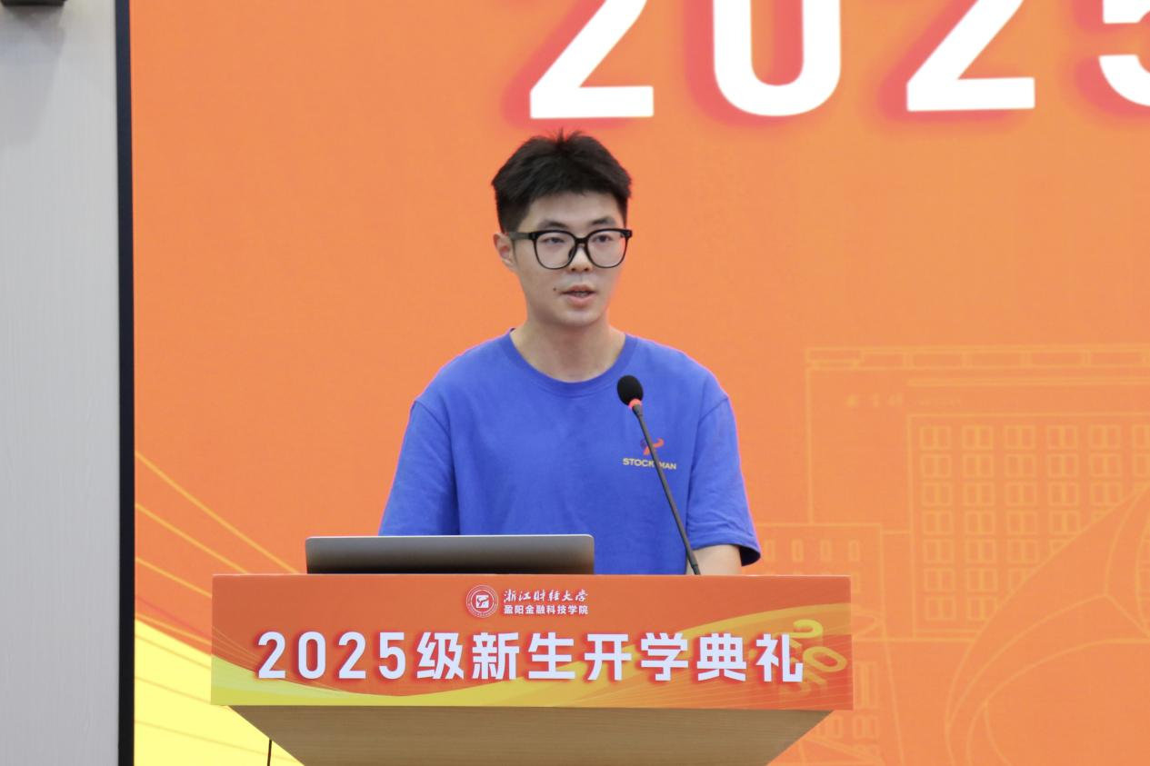 2025级新生代表裘哲文同学强调了科技与金融融合的重要性,呼吁全体新生以扎实学识和坚定信念,成为懂金融、通科技、有担当的新时代人才,共同推动金融科技教育改革与经济社会发展。