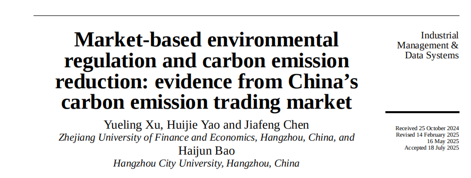 22级金融数学2班本科生姚慧杰同学在许跃龄老师指导下撰写的论文《Market-Based Environmental Regulation and Carbon Emission Reduction: Evidence from China’s Carbon Emission Trading Market》,正式发表于跨学科领域国际学术期刊《Industry Management & Data System》。该期刊为SCI Q2分区,同时也是我校认定的外文一级B类期刊。这是成人影视片