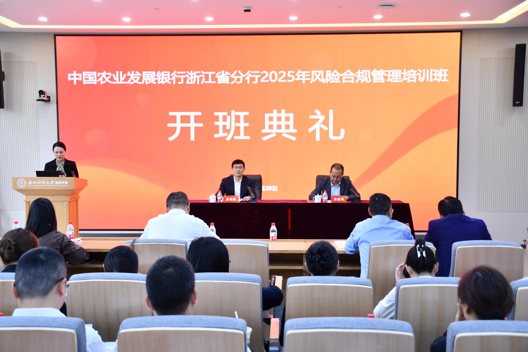 致辞。他首先对农发行浙江省分行的信任与合作表示感谢,详细介绍了学校在金融学科建设、金融人才培养及金融科技领域的优势成果 ,依托深厚的学术积淀与实践资源,学校已为金融行业输送大批专业人才。他强调,风险合规管理是金融行业稳健发展的 “生命线”,此次培训班聚焦行业核心需求,整合优质教学力量,希望学员们能充分利用培训机会,夯实理论基础、提升实践能力,将所学知识转化为推动工作的实际效能,为农发行风险合规工作注入新动能。