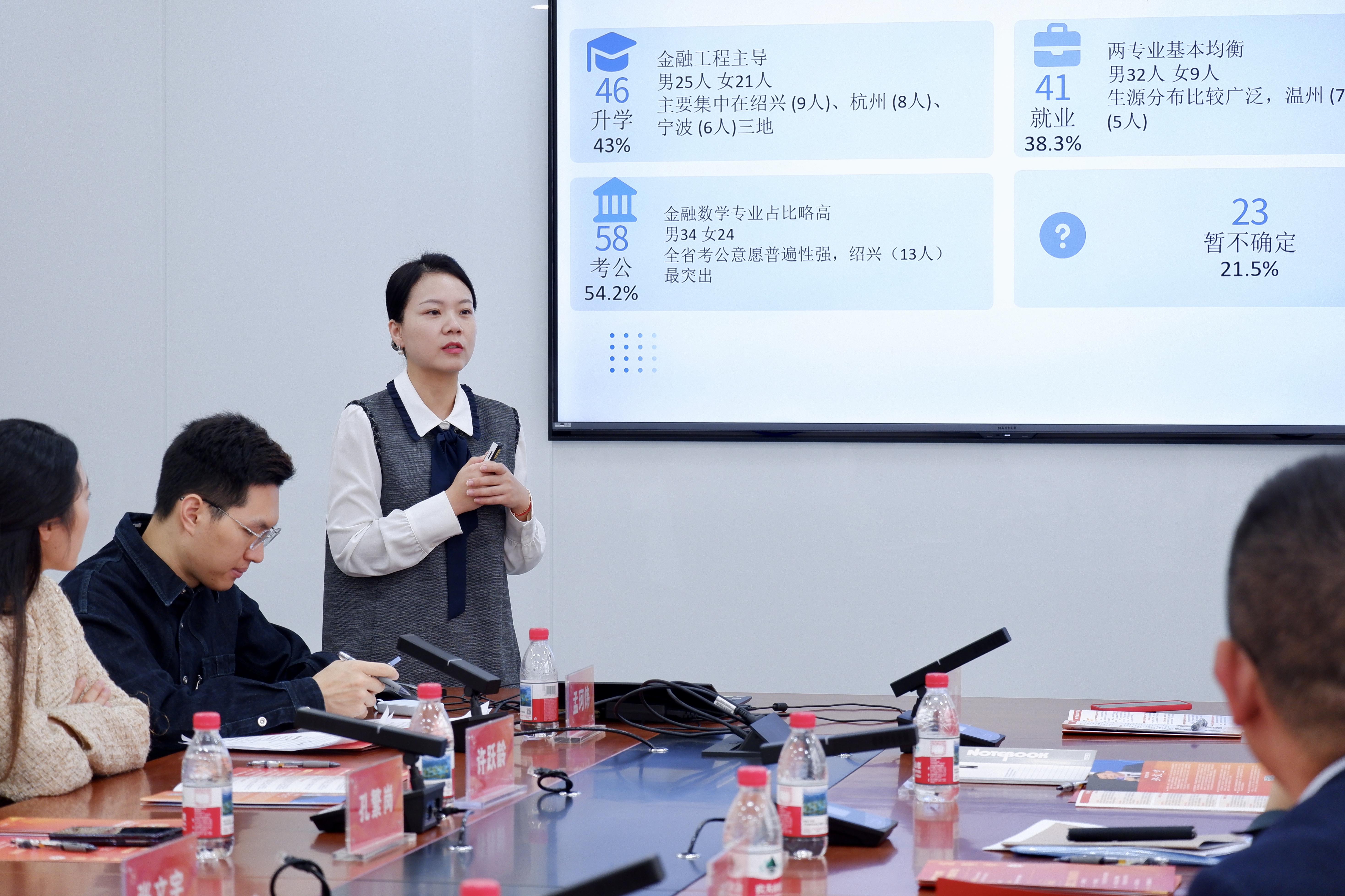 喻贞首先作“2026届毕业生情况与实践情况”专题报告。她围绕 “毕业生画像”“毕业生去向”“学生实践情况” 三大核心板块,系统呈现2026届毕业生培养成效。她指出,学院毕业生兼具扎实专业功底与鲜明适配优势,发展路径呈现多元分流格局,学院坚持产教融合核心路径,通过搭建多领域实践平台、开展沉浸式学习与特色实践活动,搭配学科竞赛赋能,全方位锤炼学生实践创新能力与社会责任感,持续为行业与区域发展输送高素质金融人才。