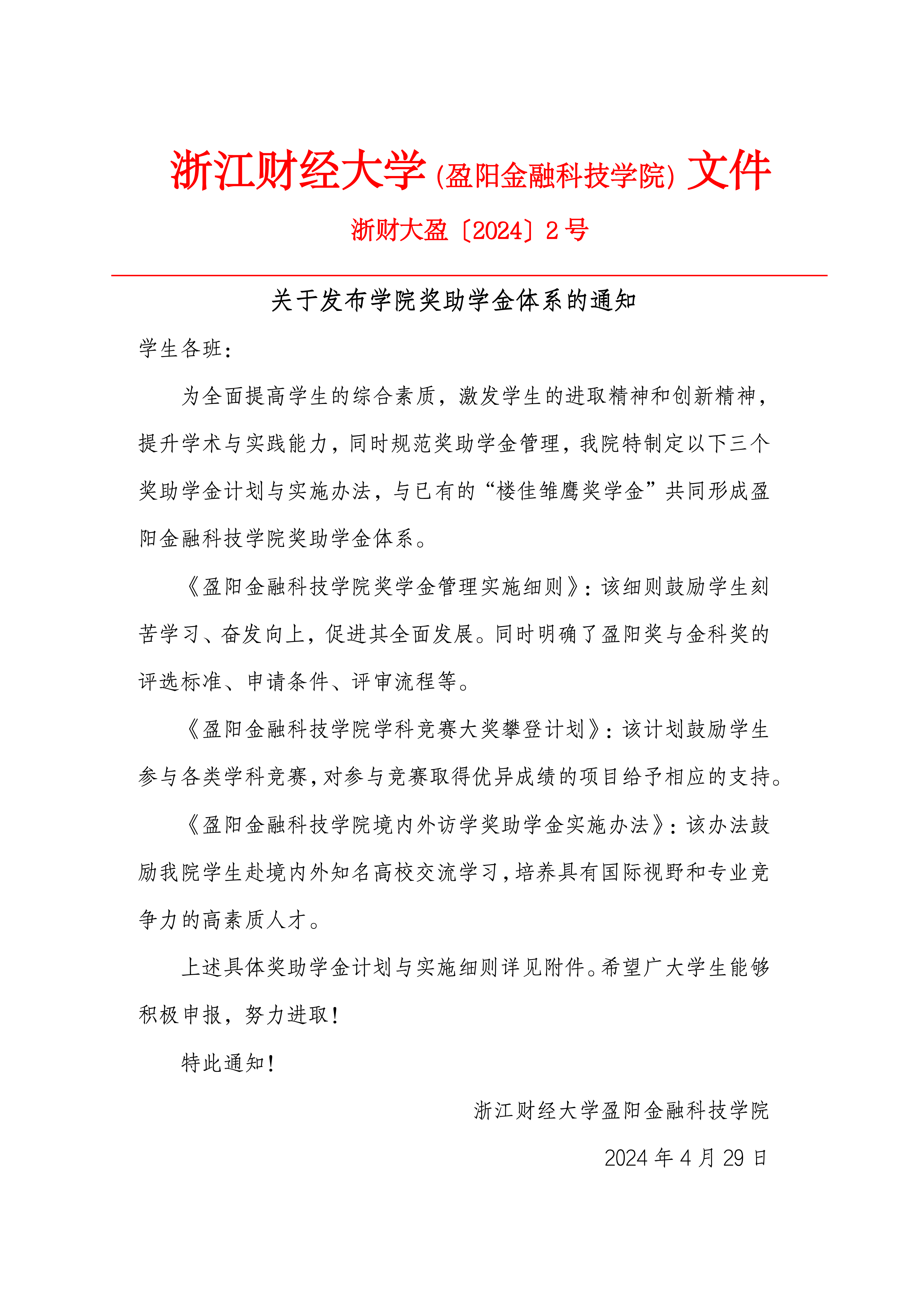 关于发布学院奖助学金体系的通知