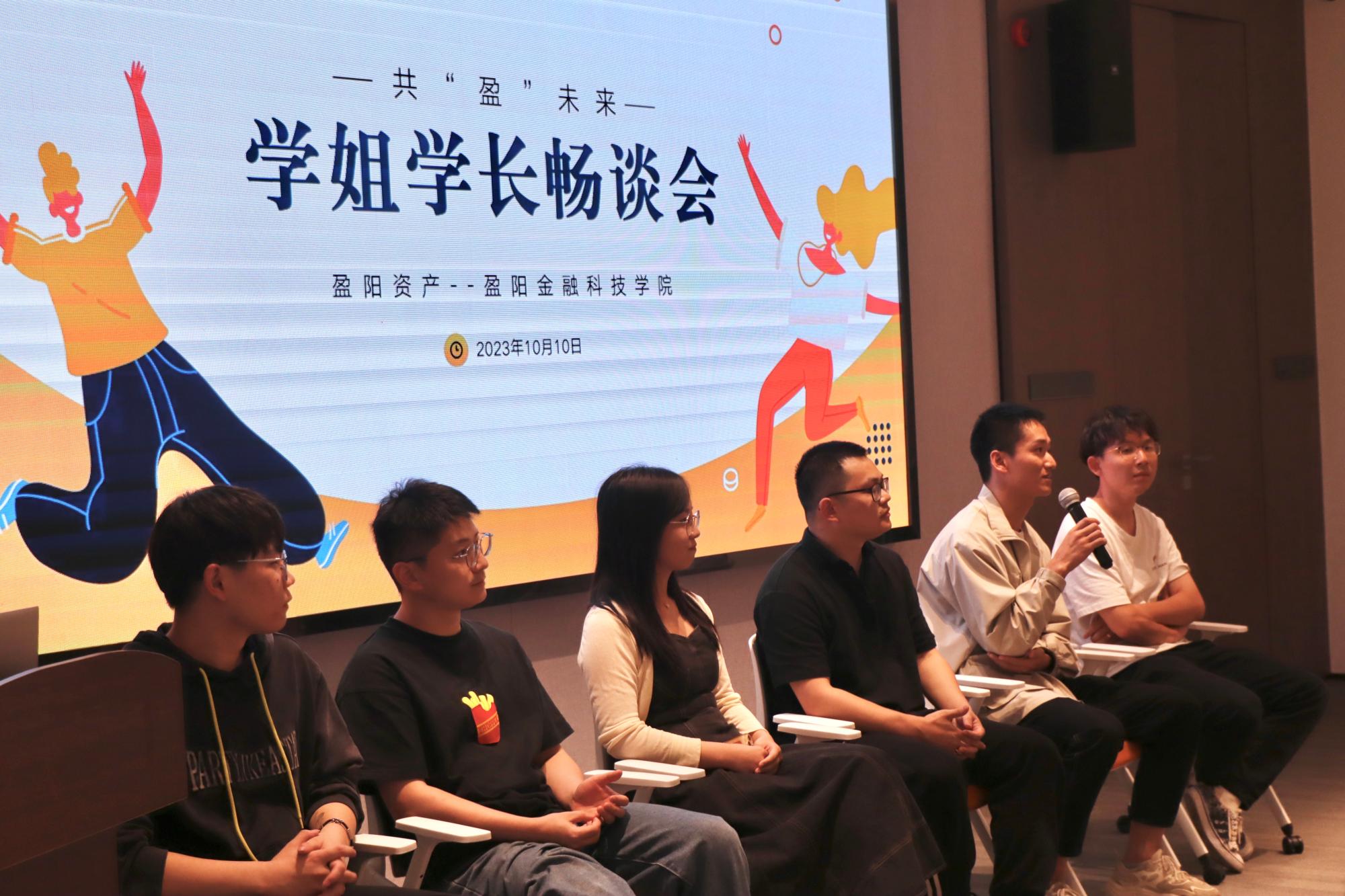22级刘渝畅、孟圣杰同学分享了暑期在盈阳资产实习的经历以及在过去一年中实践学习中带来的收获。作为优秀实习学员,他们为学弟学妹们提供了专业学习和未来规划的建议,并表示同学们要好好把握学院给予的实践学习机会。