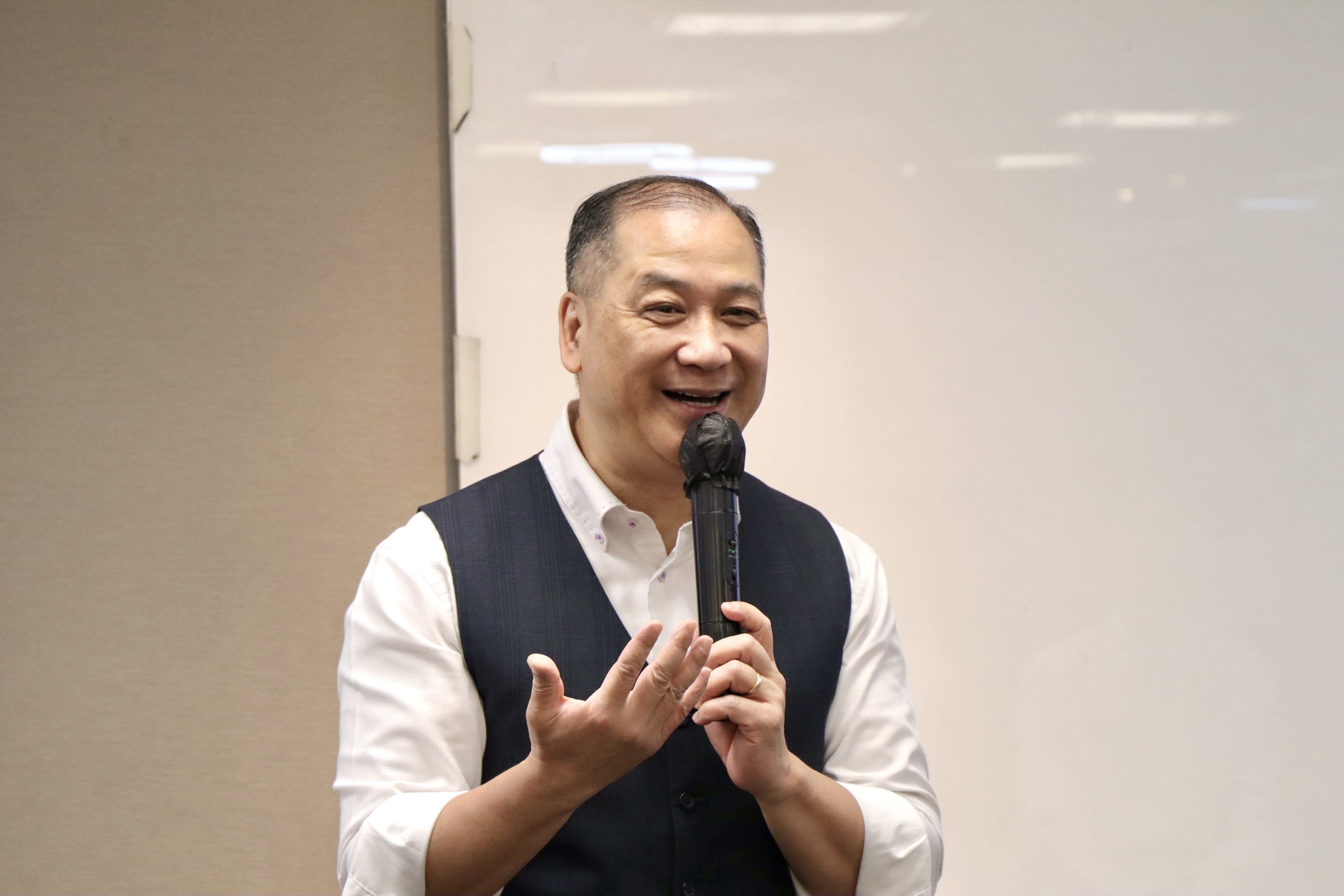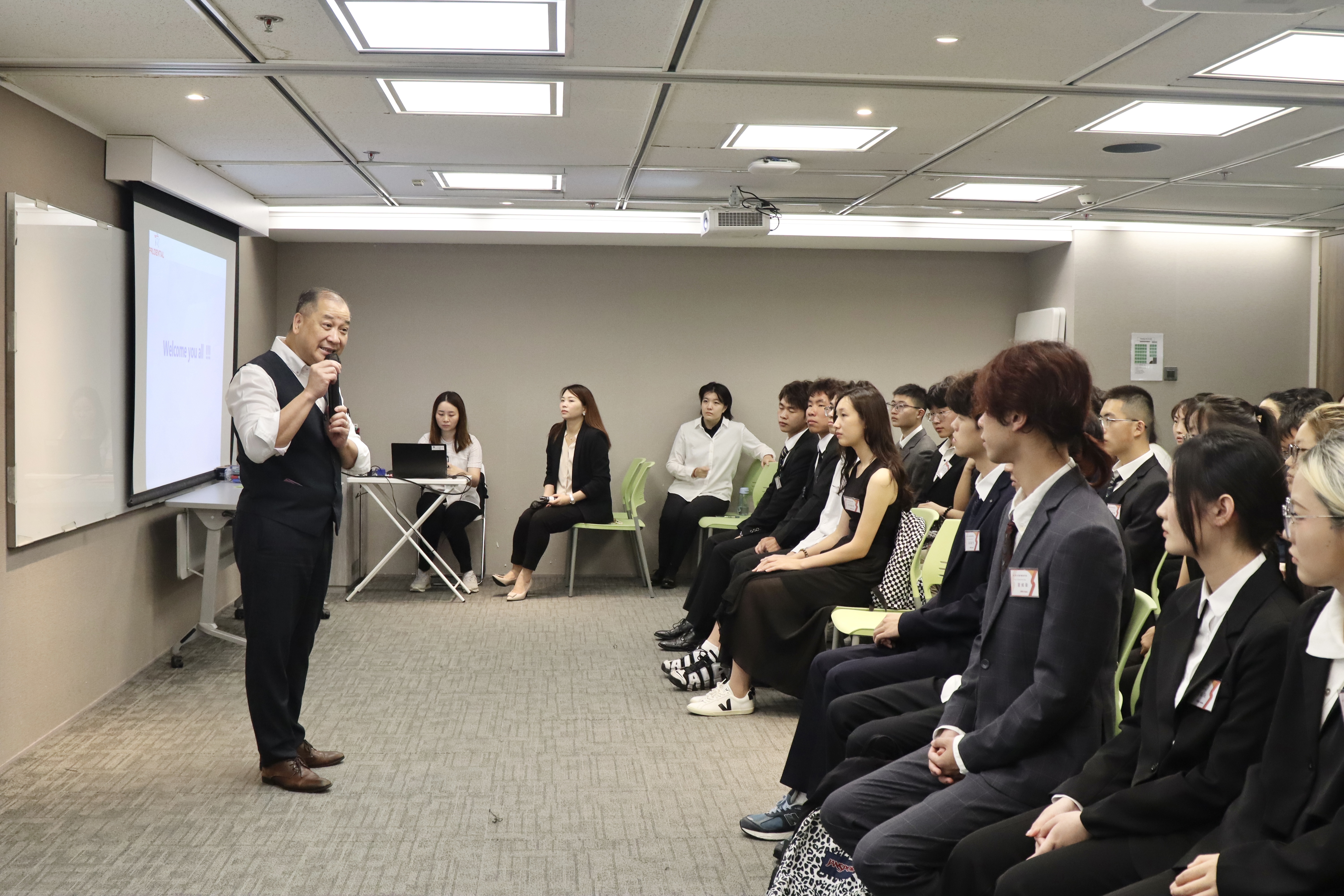 许伟棠为初入职场的实习生们特别开展了“一分钟自我介绍法”专题课程。他强调在竞争激烈的求职市场中,一个精彩的一分钟自我介绍能给面试官留下深刻印象,为求职成功的关键一步。他详细讲解了自我介绍时应遵循的原则和技巧,并说明了时间控制、眼神交流以及身体语言等非语言因素的运用,通过“VAK”(视觉、听觉、感觉)三个方面给他人留下自信、专业且深刻的形象。访学团成员积极参与其中。